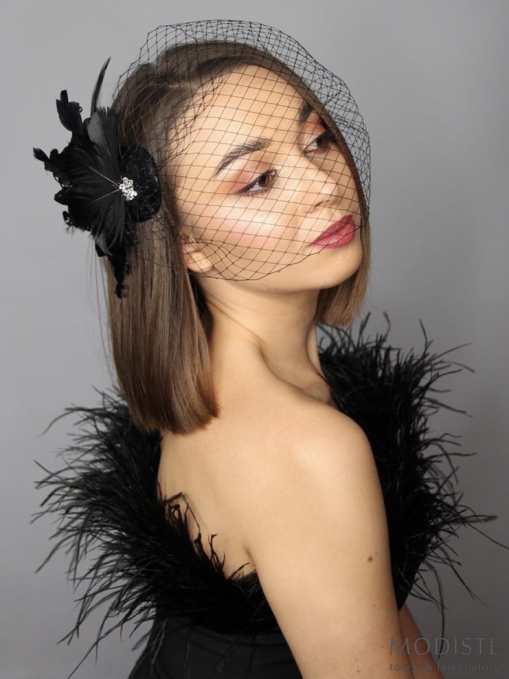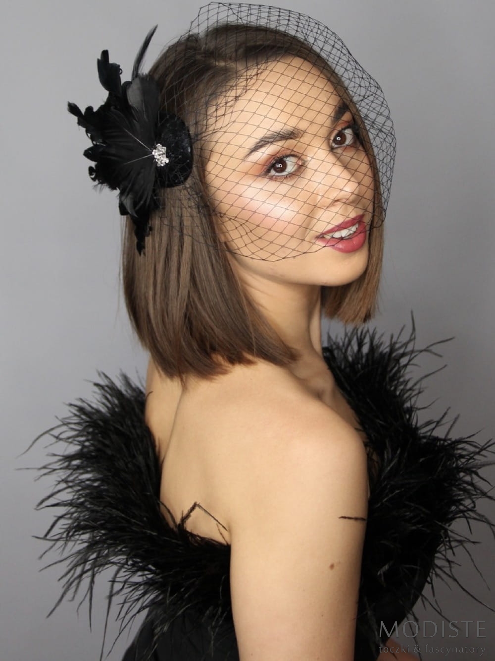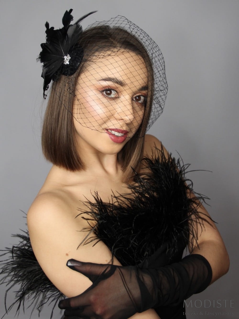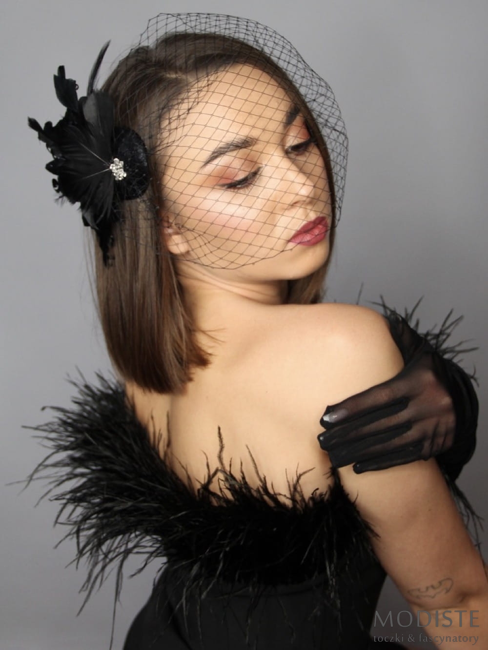 - Woalka: Czarna, delikatna woalka dodaje fascynatorowi tajemniczości i klasy.