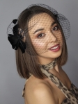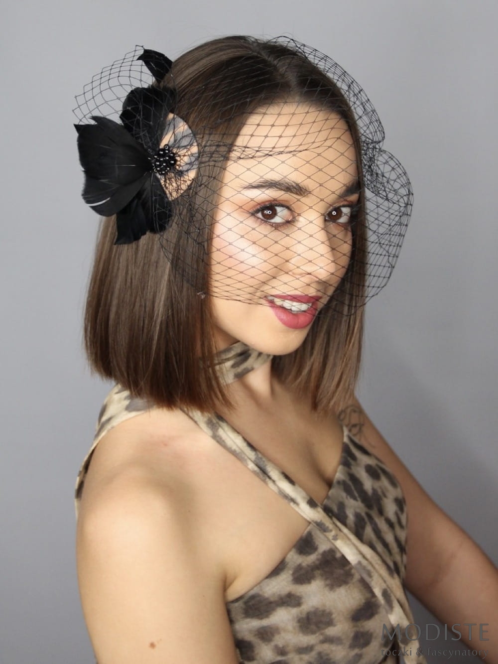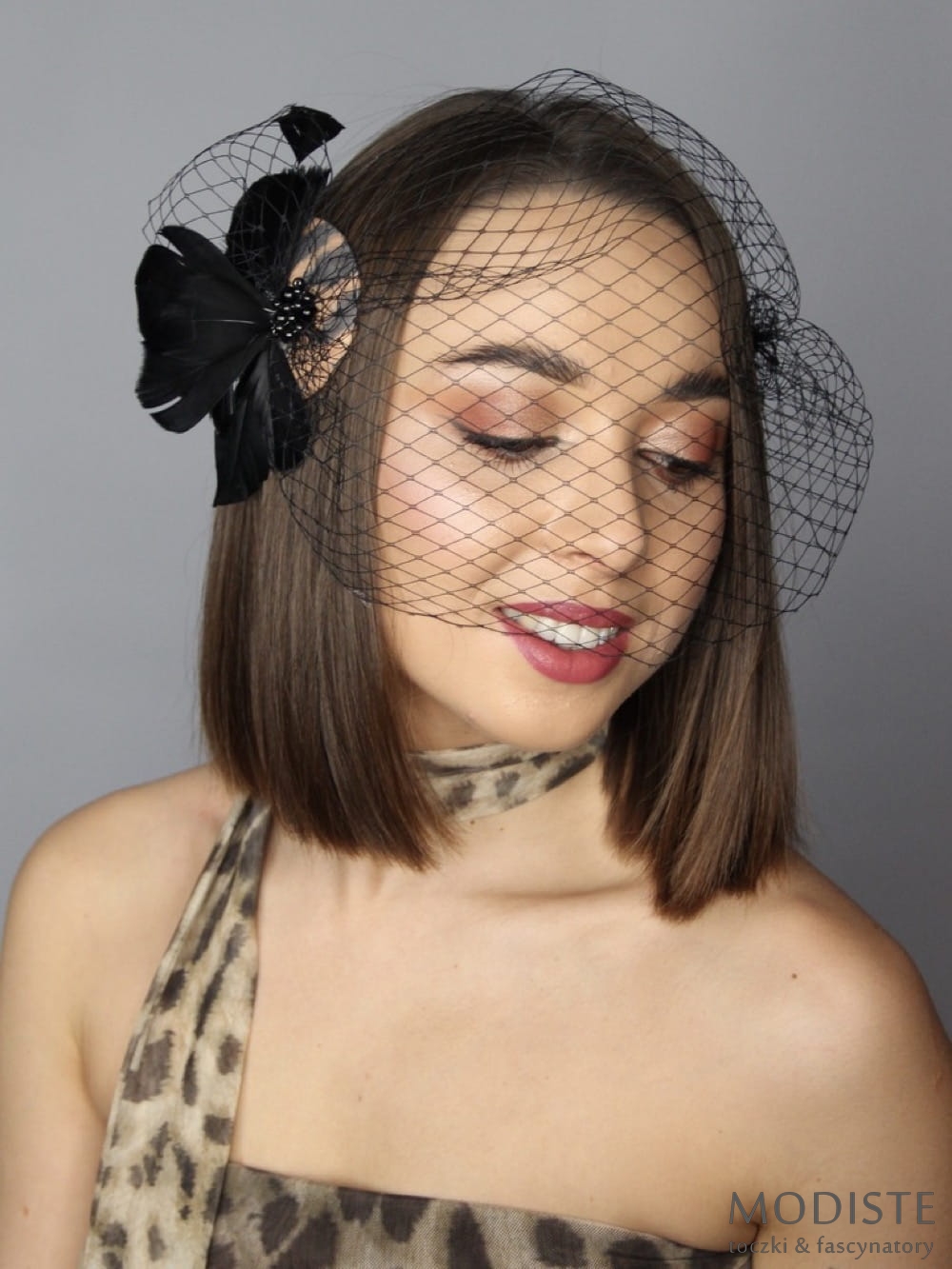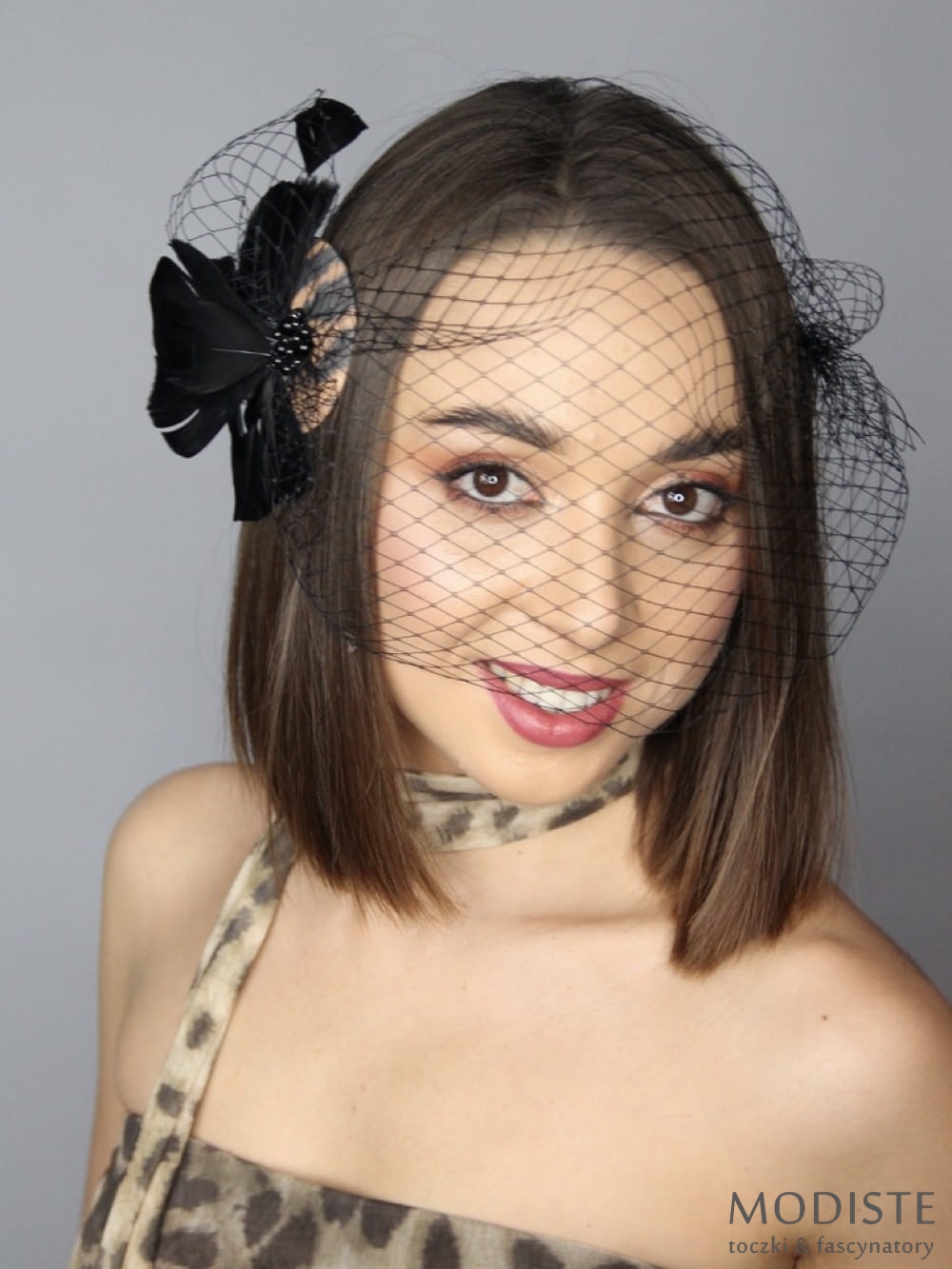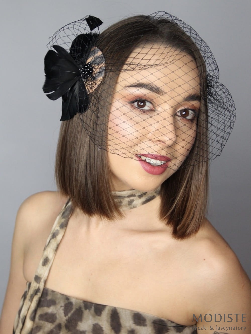 fascynator, woalka, czarna, pióra, onyks, zwierzęcy print, elegancki, wieczorowy, ślub, wesele, moda damska, akcesoria