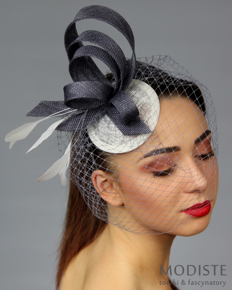 fascynator, szary, biały, sinamay, woalka, futurystyczny, okręgi, pióra, elegancki, oryginalny, wesele, gala, moda damska, akcesoria