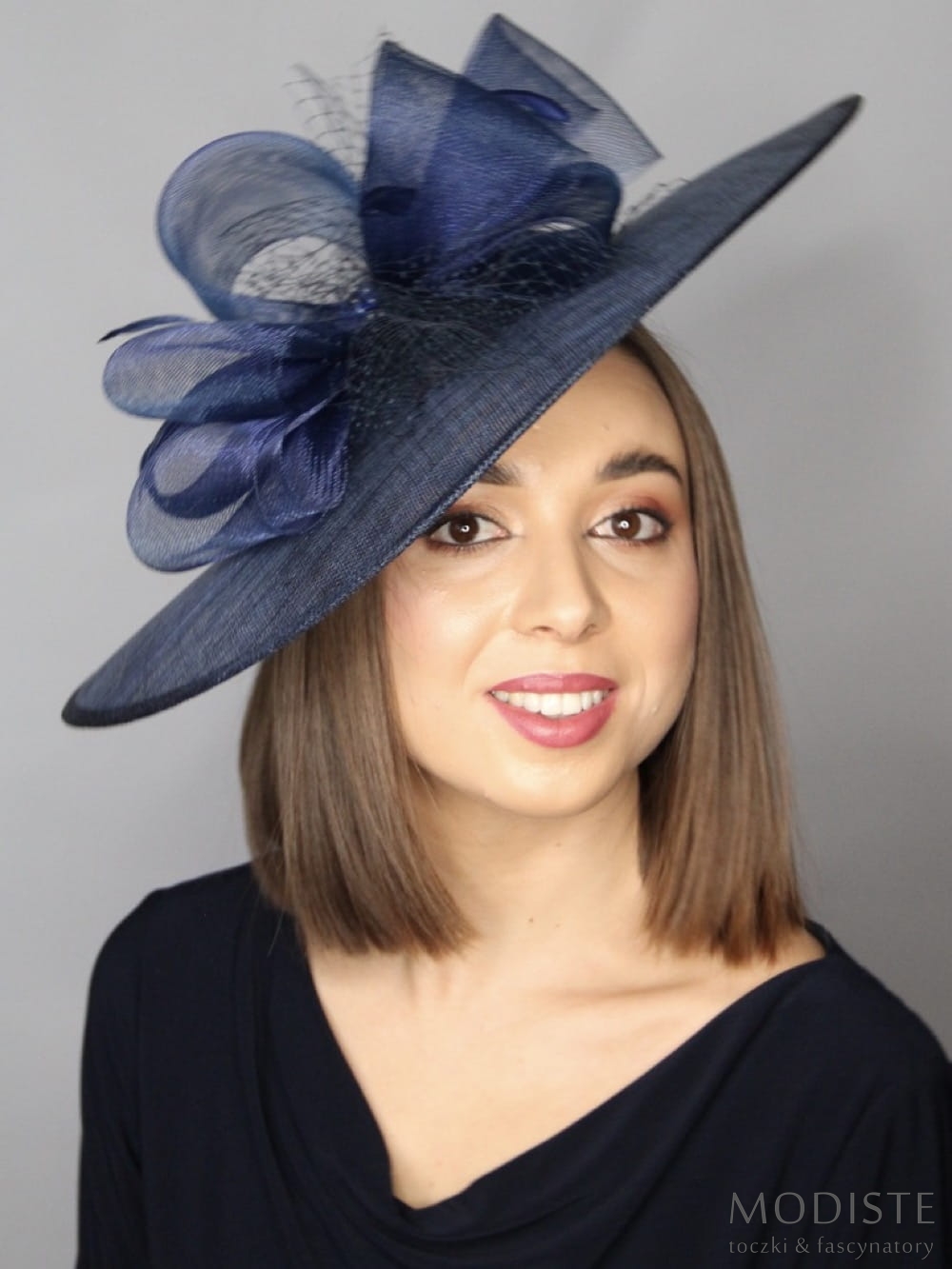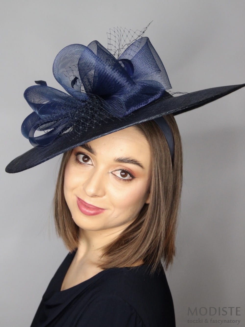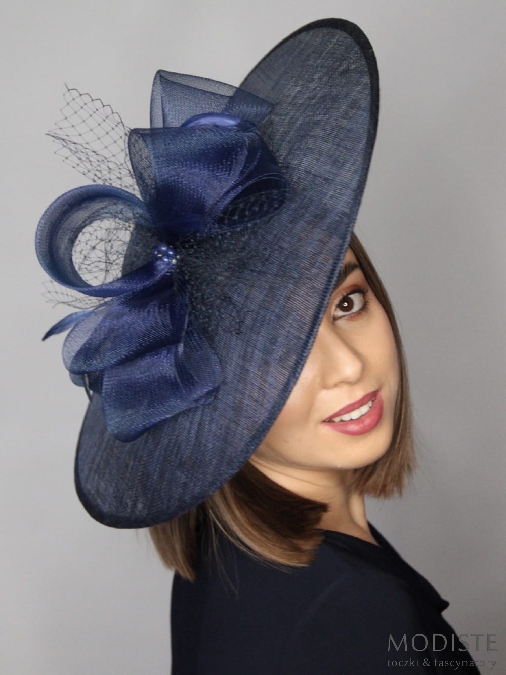 kapelusz koktajlowy, granatowy, sinamay, krynolina, jadeit, elegancki, wyjątkowy, orientalny, moda damska, akcesoria