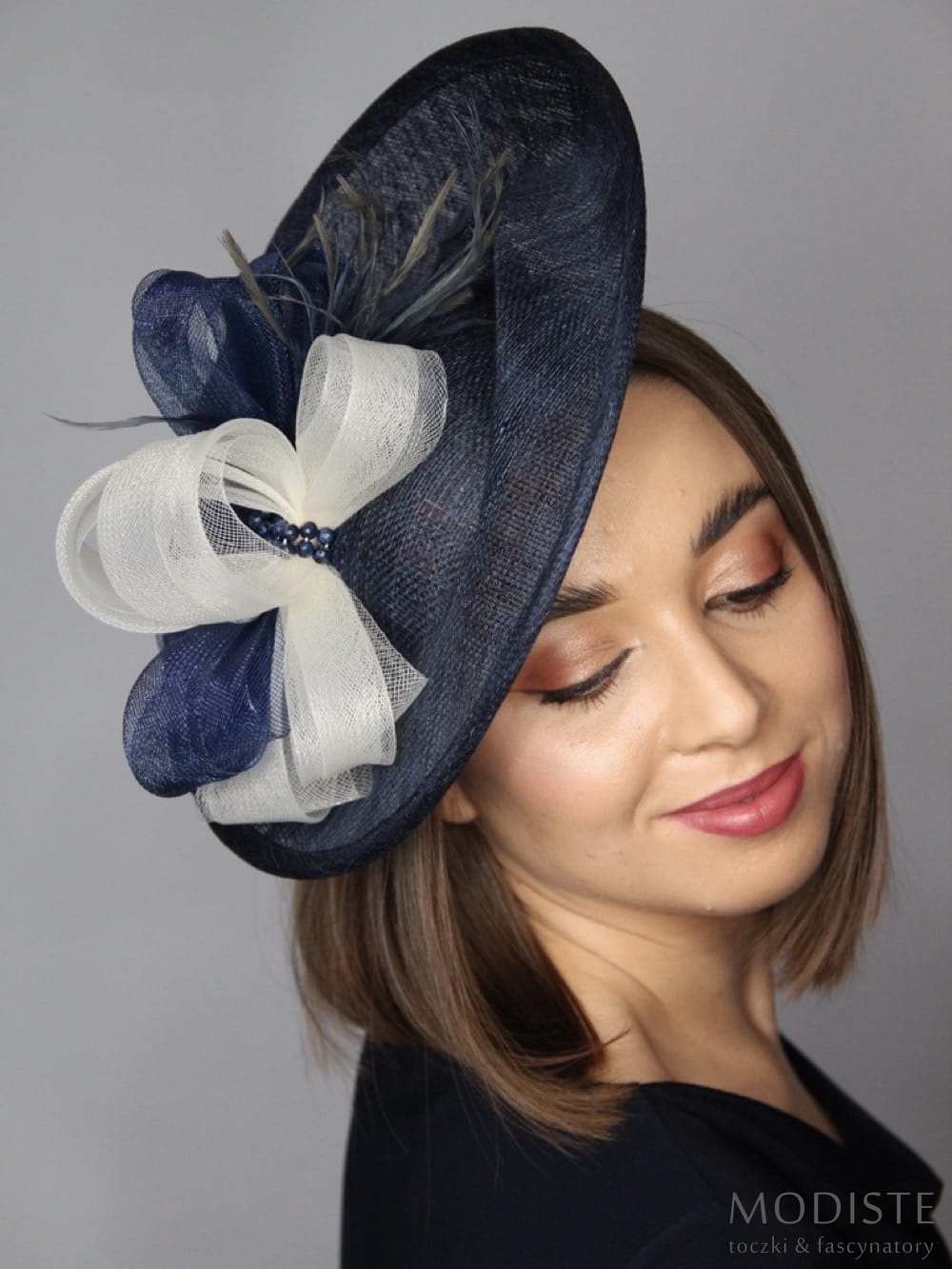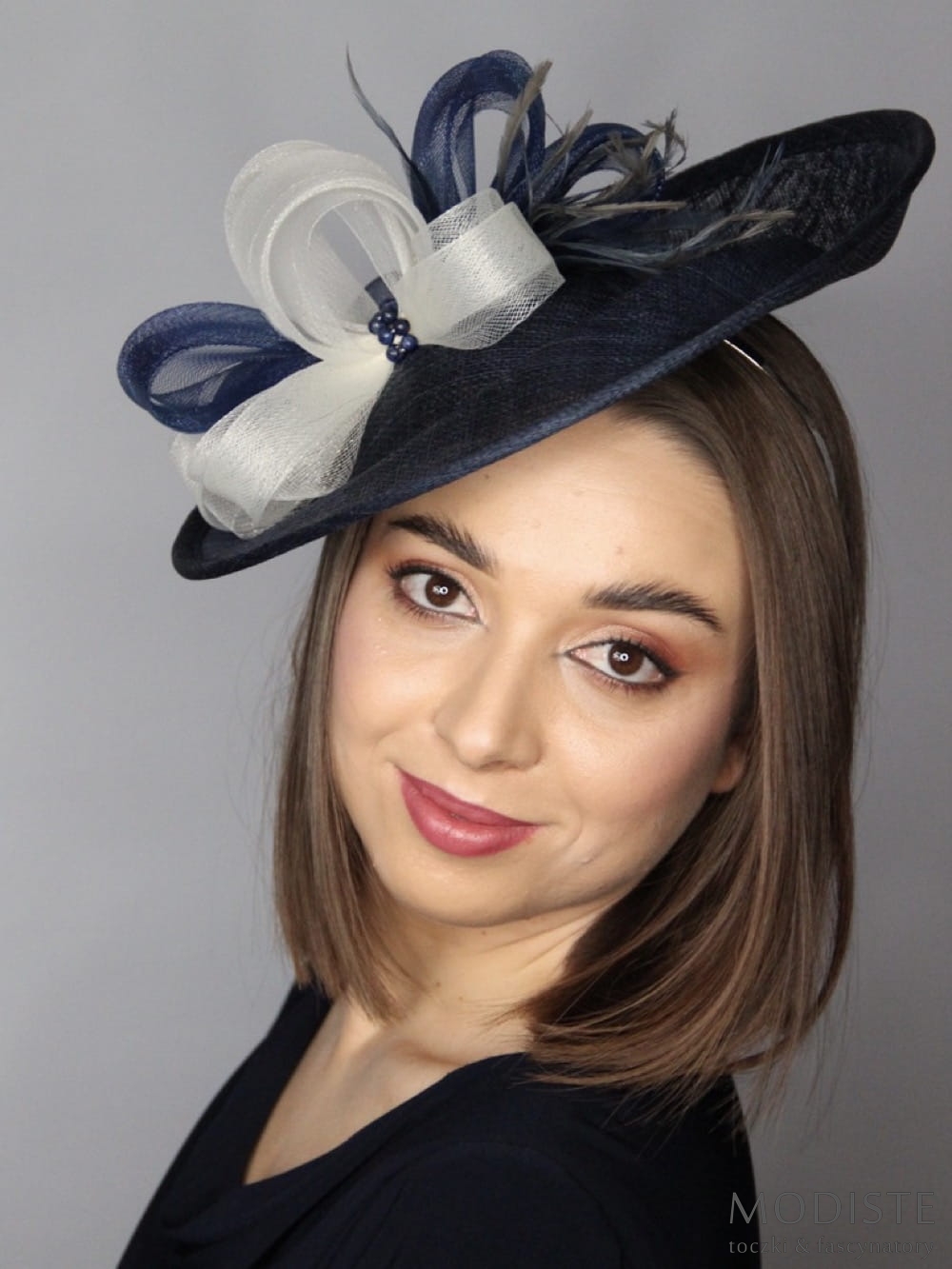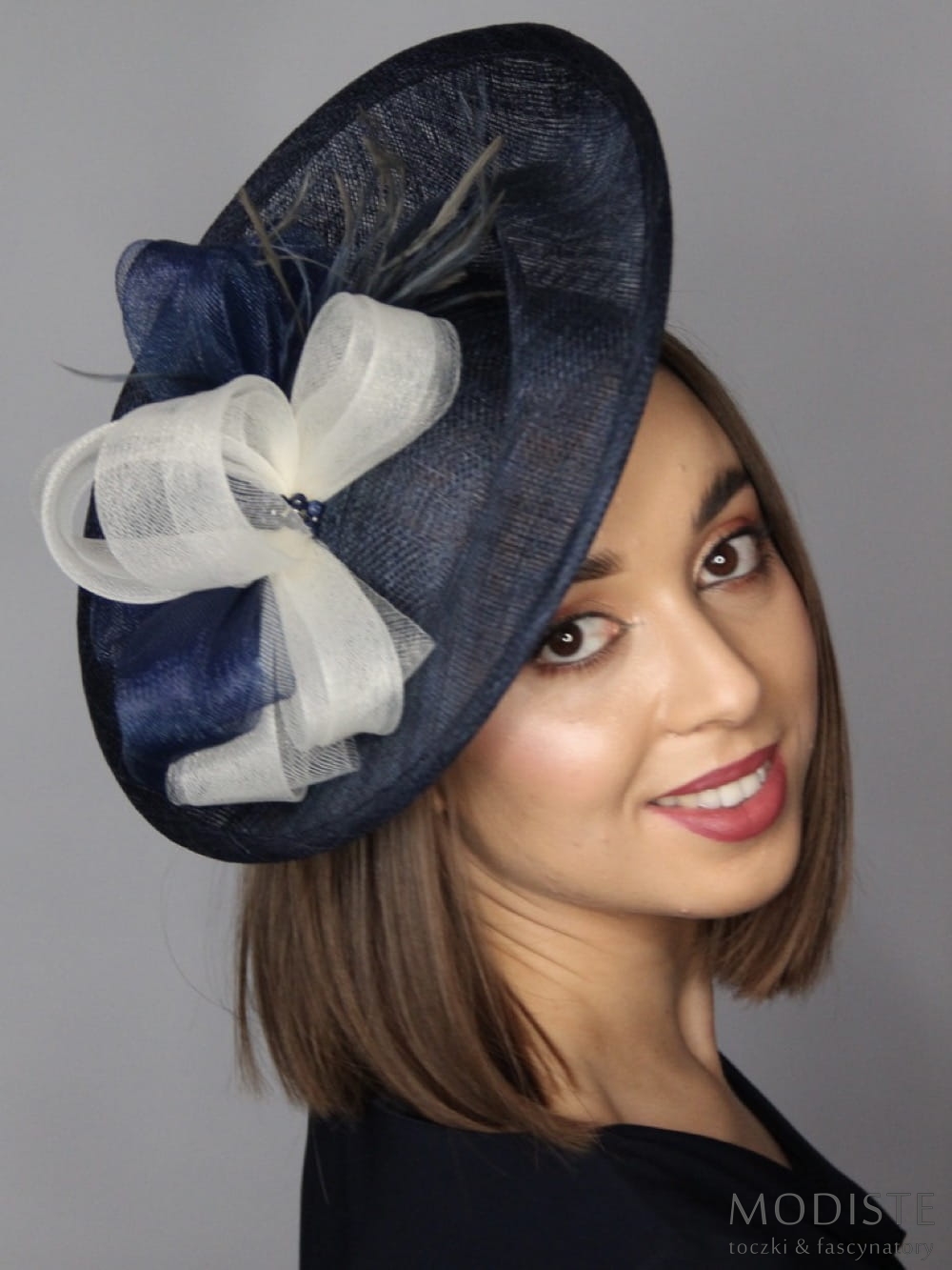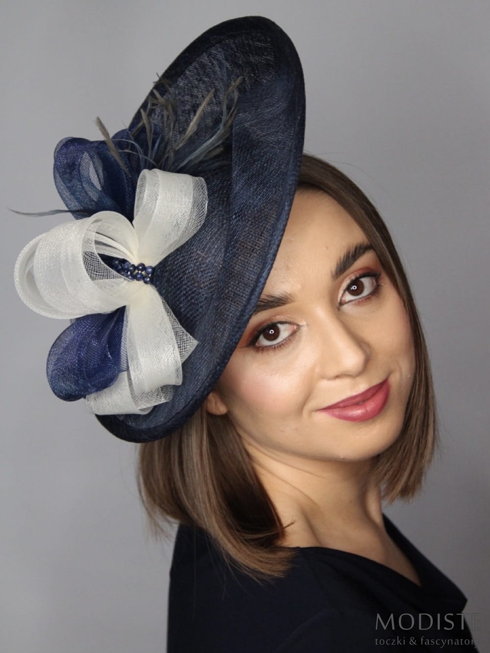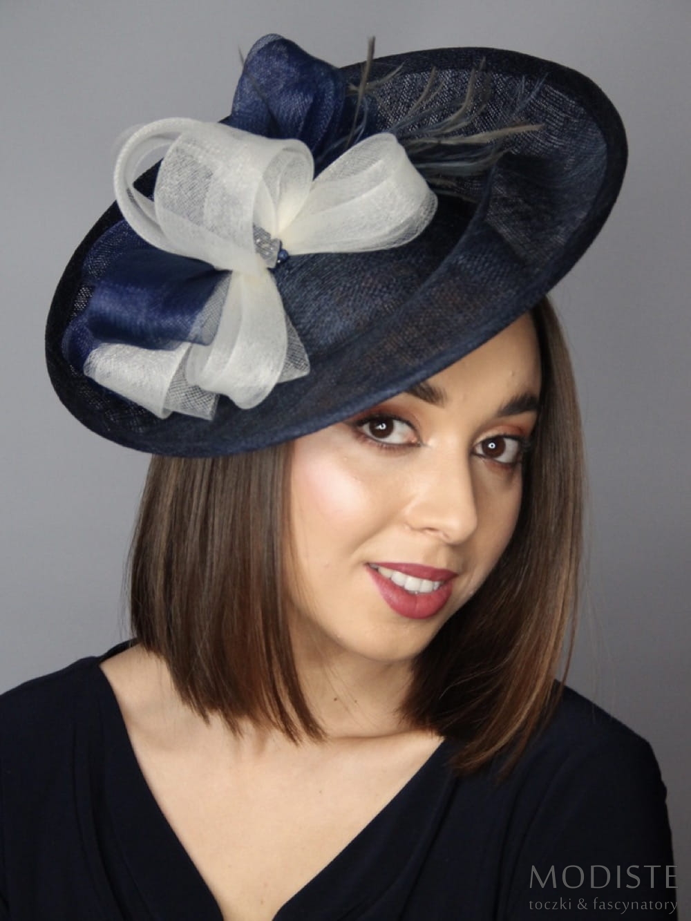 kapelusz damski, granatowy, sinamay, krynolina, elegancki, nowoczesny, przesuwana opaska, srebrny, moda damska, akcesoria