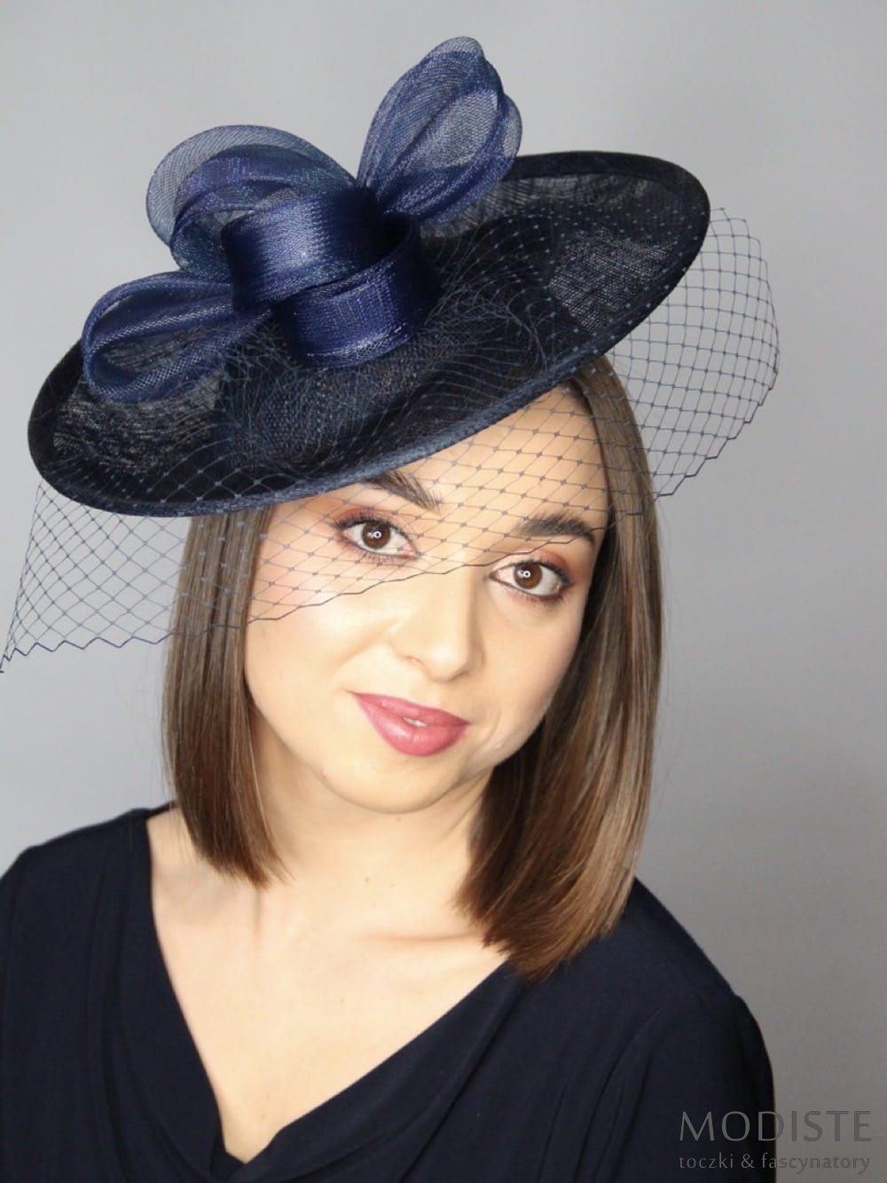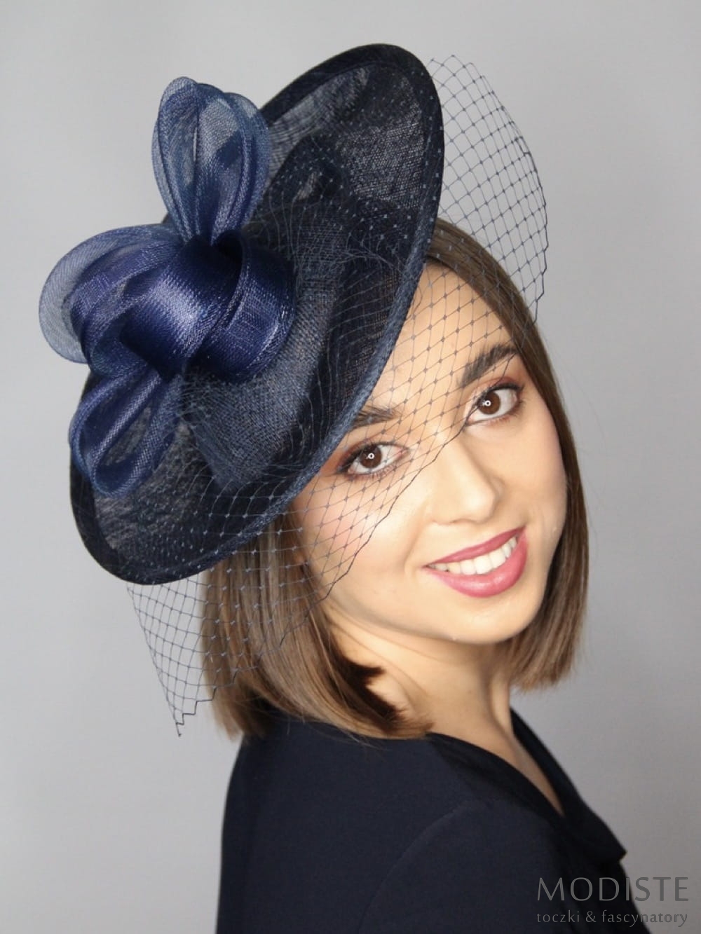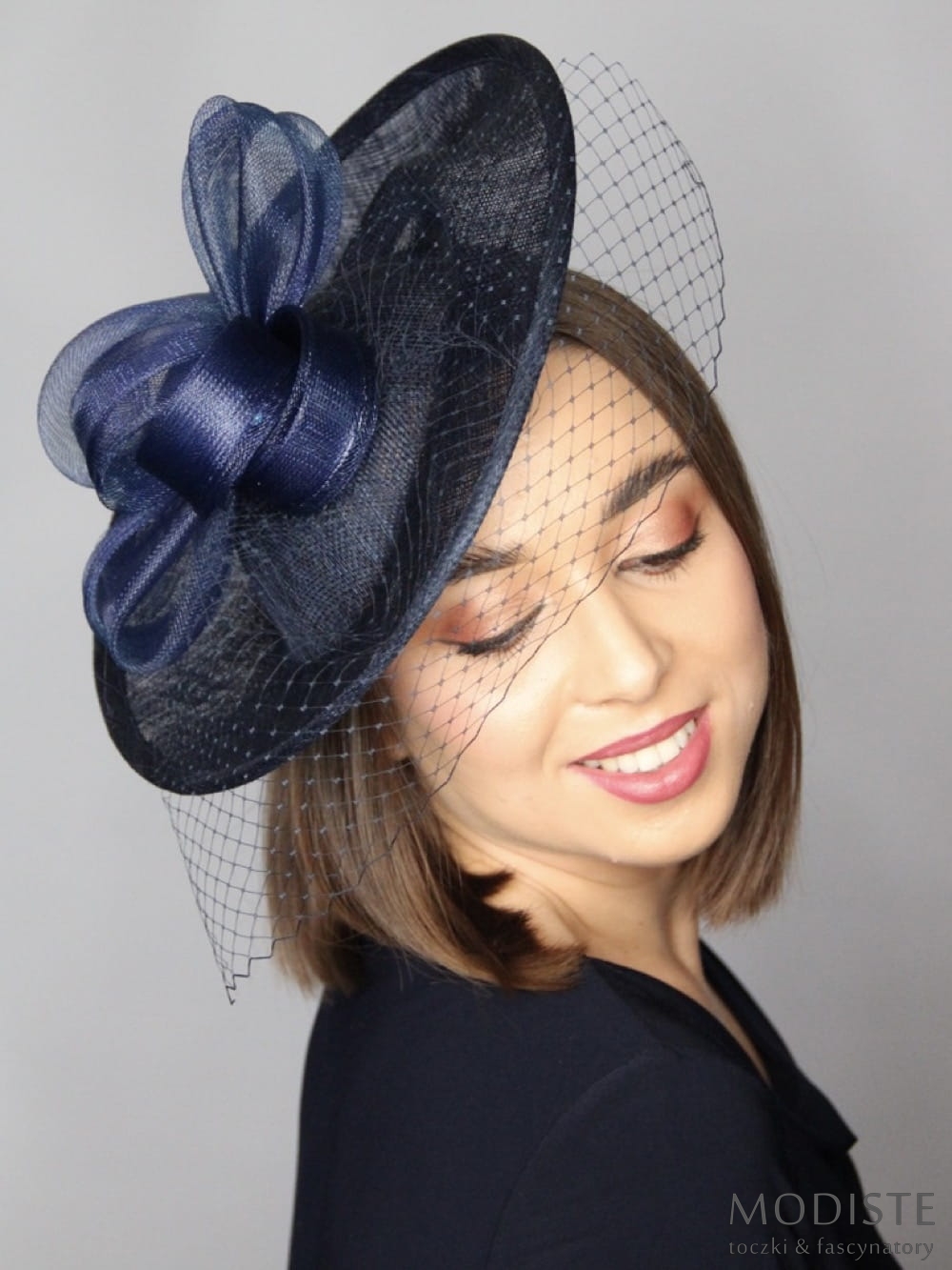 kapelusz damski, granatowy, sinamay, krynolina, elegancki, nowoczesny, przesuwana opaska, srebrny, moda damska, akcesoria