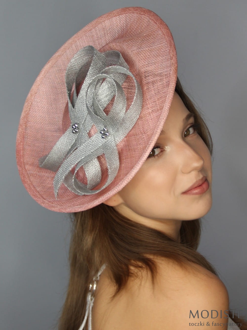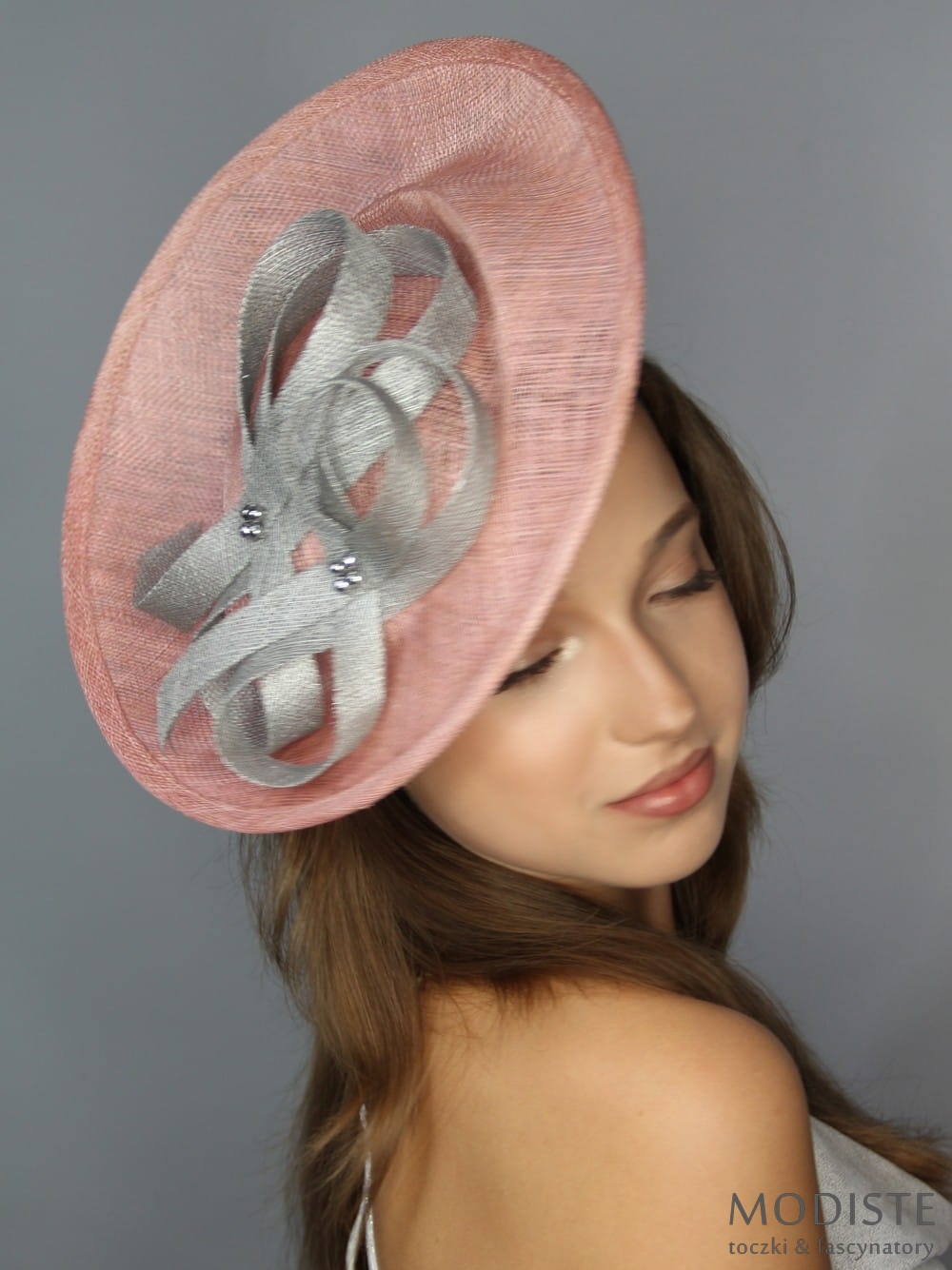 Marzysz o kapeluszu, który doda Twojej stylizacji wyjątkowej elegancji? Nasz łososiowy kapelusz koktajlowy z dwoma ciekawymi upięciami z taśmy sinamay w kolorze srebrnym to idealny wybór dla kobiet, które lubią podkreślać swój indywidualny styl. Dodatkowym zdobieniem kokardek ze srebrnego sinamay w kształcie znaku nieskończoności sa koraliki hematytu w kolorze srebrnym. Kapelusz jest zamocowany na cienkiej, metalowej opasce koloru srebrnego.