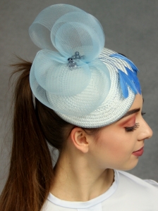 toczek, błękitny, buntal, krynolina, pióra, koraliki, delikatny, romantyczny, wesele, chrzciny, moda damska, akcesoria