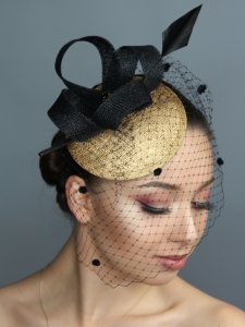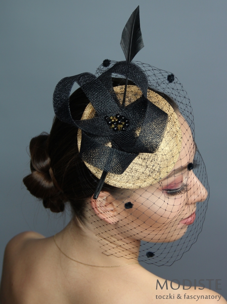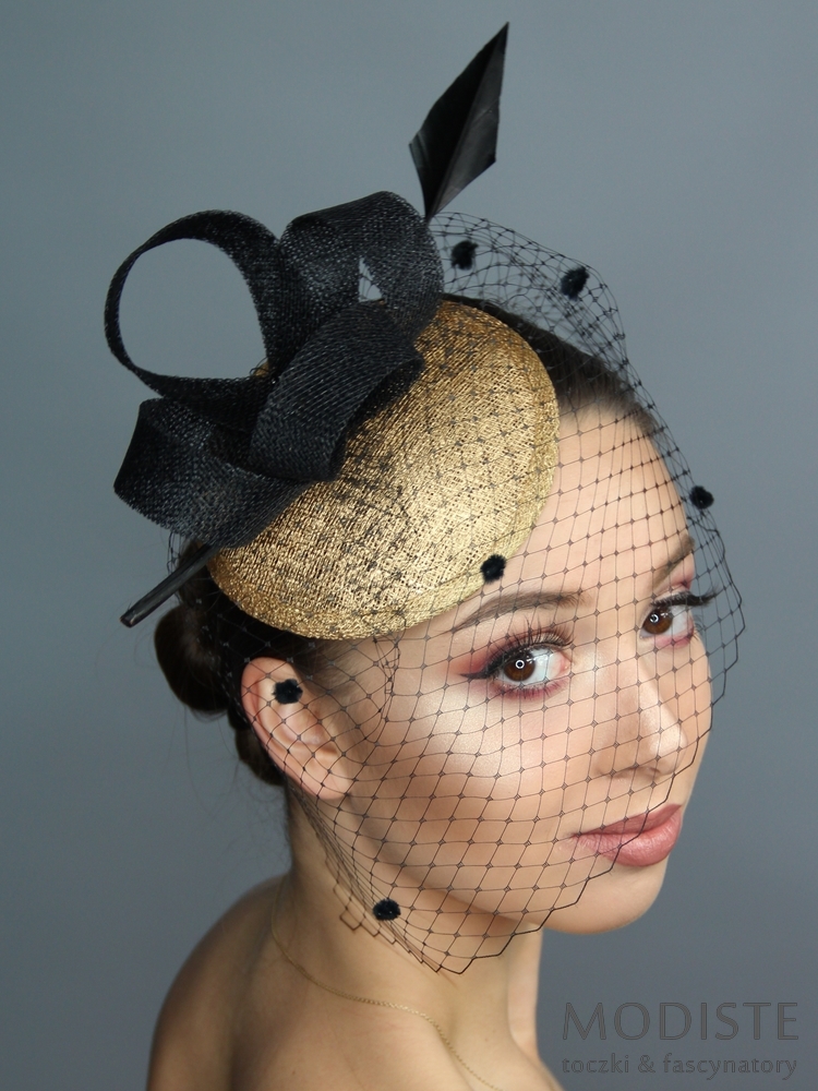 toczek, sinamay, złoty, czarny, onyks, pióro, woalka, elegancki, wyjątkowy, bal, gala, Sylwester, teatralny, moda damska, akcesoria